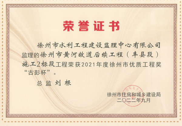 根據(jù)《徐州市優(yōu)質(zhì)工程獎“古彭杯”評選辦法》2022年9月23日,徐州市住房和城鄉(xiāng)建設(shè)局以徐住建發(fā)[2022]161號文,公布2021年度徐州市優(yōu)質(zhì)工程獎“古彭杯”和徐州市優(yōu)質(zhì)結(jié)構(gòu)工程獎獲獎情況,我單位監(jiān)理的“黃山大道污水管網(wǎng)提質(zhì)增效工程”、“2018年新沂市村莊生活污水治理EPC工程”、“豐縣村莊污水治理工程”、“徐州市不牢河治理工程施工4標(biāo)段”、“徐州市黃河故道后續(xù)工程(豐縣段)施工2標(biāo)段”、“徐州市鄭集河輸水?dāng)U大工程鄭集東站增容改造工程”6個工程獲得獎項(xiàng)。